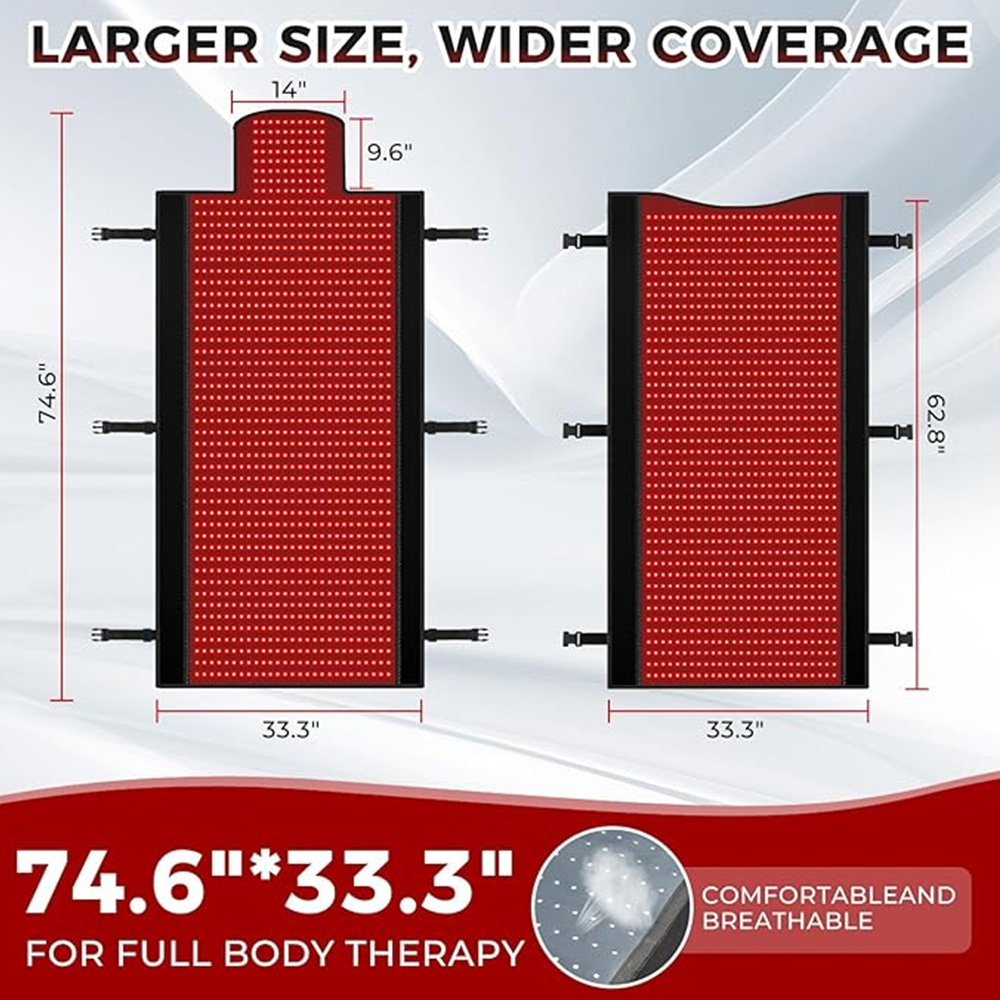 - Full-Body Coverage: Experience total body relaxation with our 74.6” x 33.3” red light therapy mat, designed to deliver comprehensive red light therapy at home. Its large rectangular surface includes extended therapy zones for the neck and head, ensuring a fully immersive therapy session
